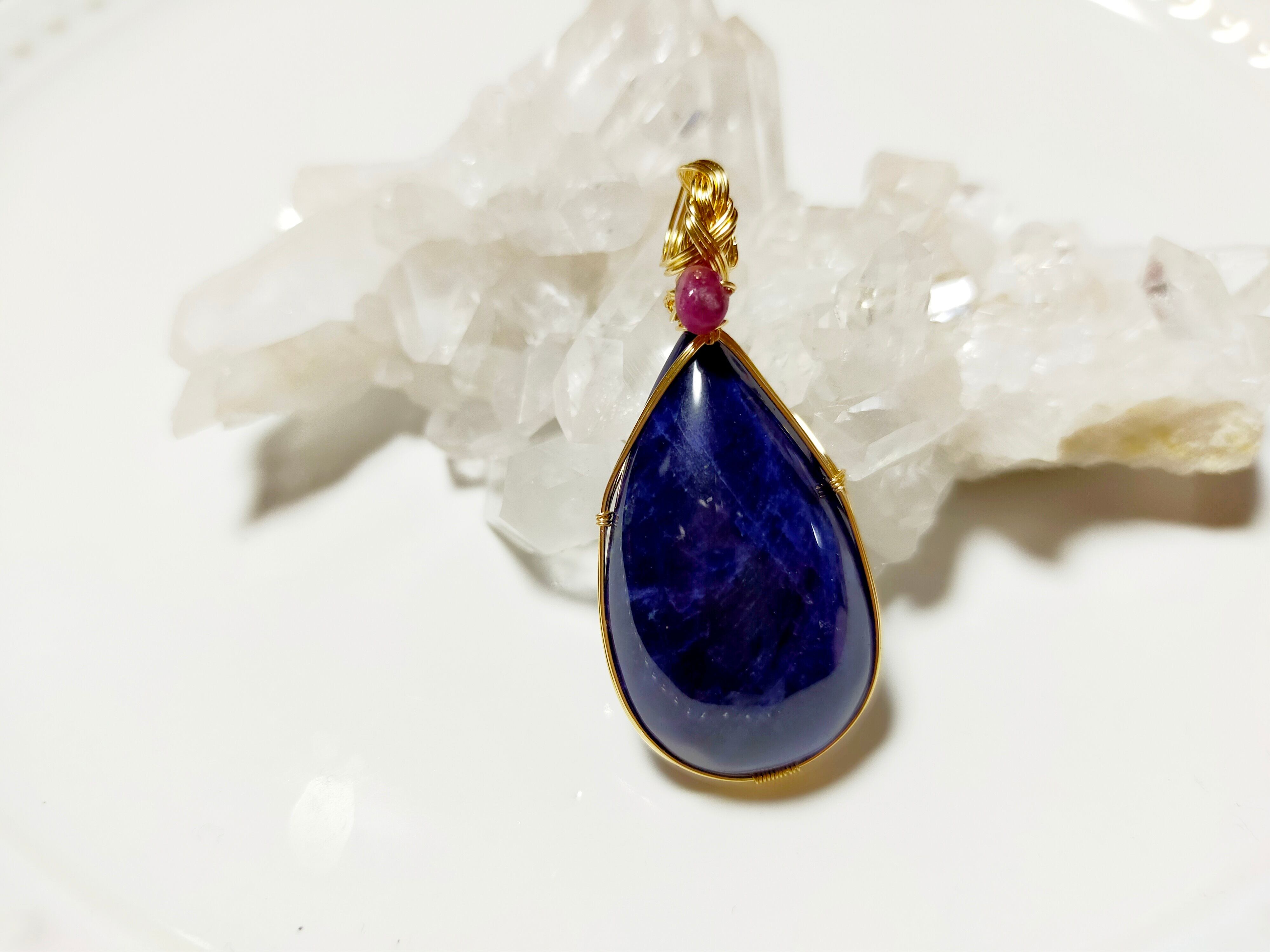 こちらは、インペリアルソーダライトのルースを使い、その艶やかで深い紺色をできる限り隠さず、シンプルに巻きあげました。